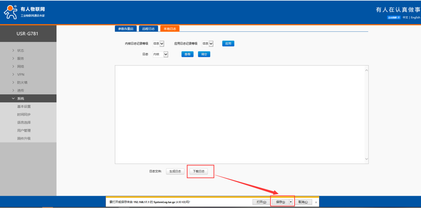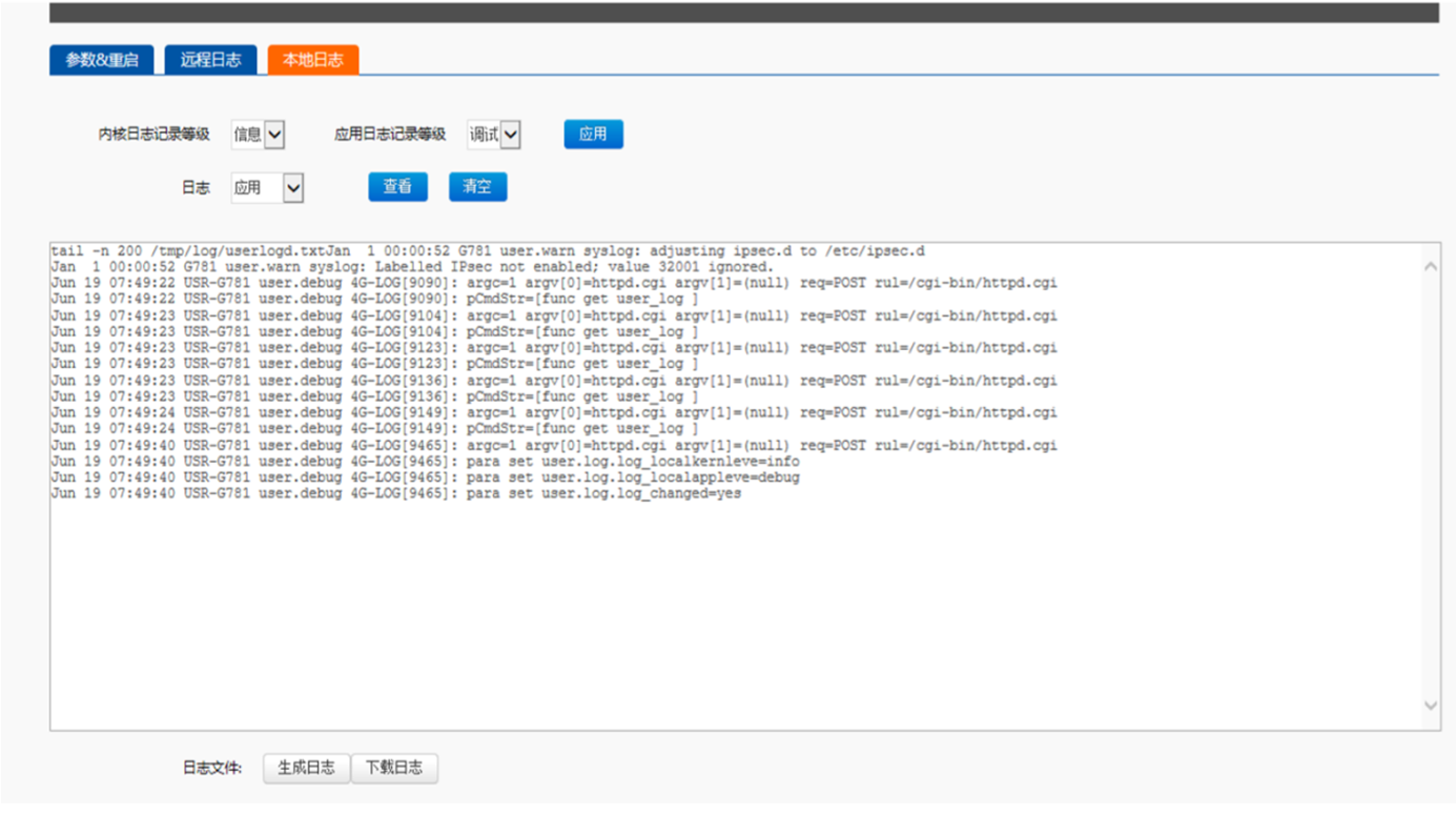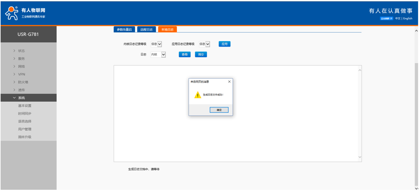 支持日志文件導(dǎo)出(先生成后導(dǎo)出),(不要修改日志等級),先點(diǎn)擊生成日志,后點(diǎn)擊下載日志。之后會生成一個壓縮包,即日志文檔。