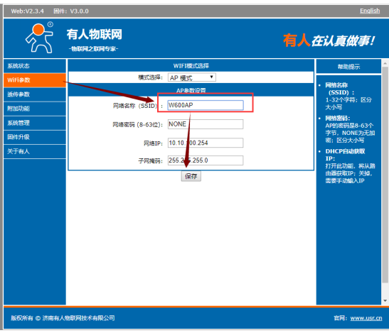 b. 打開(kāi)WiFi參數(shù),為了辨別設(shè)備作為ap的這個(gè)設(shè)備,給改下名稱設(shè)置為W600AP,然后點(diǎn)擊 確認(rèn) 保存設(shè)置