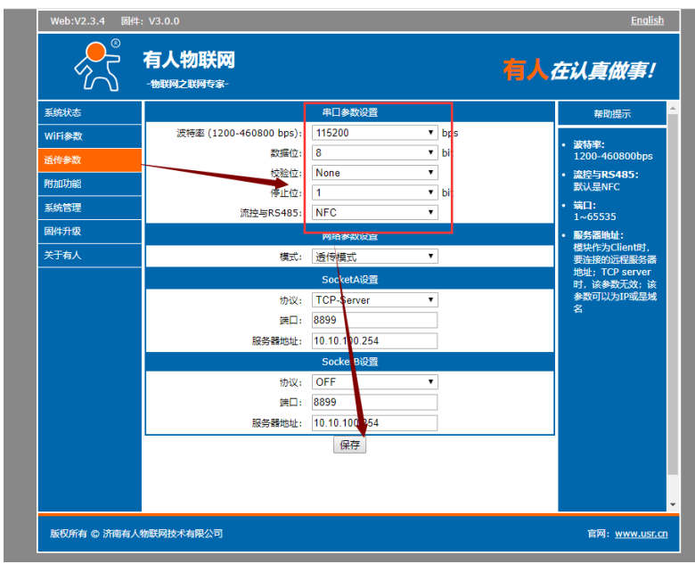 c. 進(jìn)入串口及網(wǎng)絡(luò)設(shè)置頁(yè)面 ,修改波特率等同AP模塊一致。修改完成后點(diǎn)擊 確認(rèn) 保存設(shè)置。將網(wǎng)絡(luò)參數(shù)設(shè)置中的SERVER改成CLIENT,服務(wù)器地址改為:10.10.100.254(AP設(shè)備的IP地址).