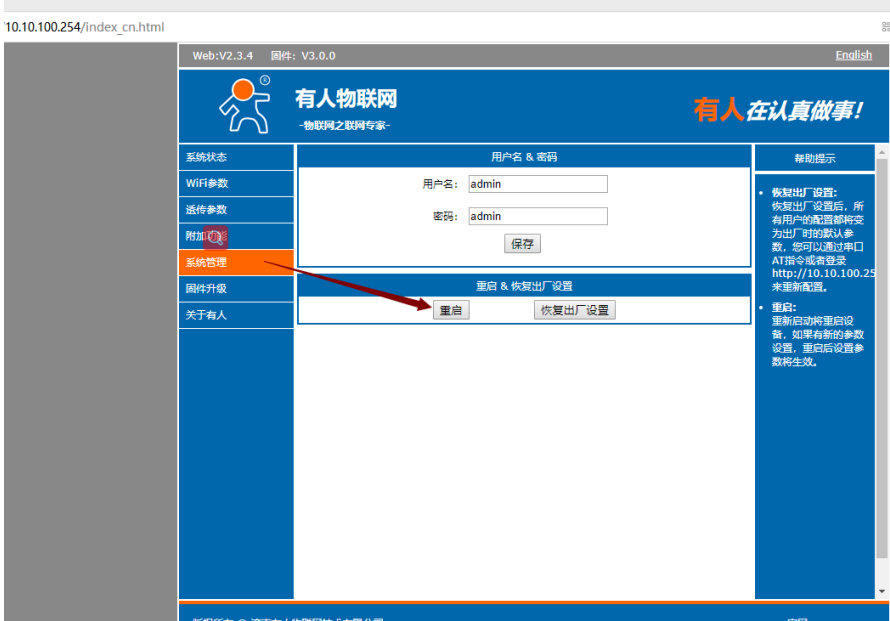 d. 進(jìn)入系統(tǒng)管理界面點(diǎn)擊 “重啟” 重啟模塊使改動(dòng)生效。此時(shí)對(duì)AP模塊的設(shè)置完成。