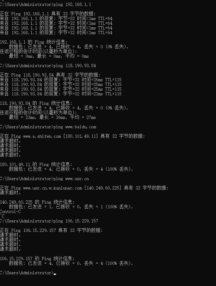 除了規(guī)則允許的192.168.1.1和118.190.93.84以外,無(wú)法ping通