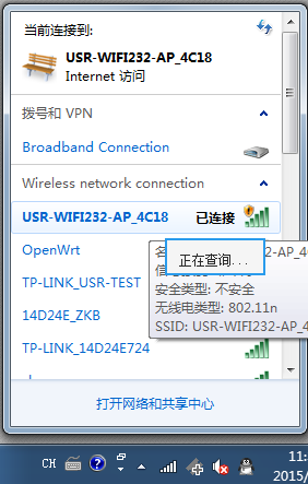 1:模塊默認為AP模式下,在電腦上搜索HF-A11xAP的SSID。電腦連接上模塊的SSID。