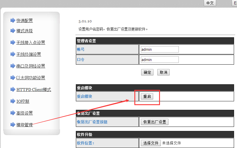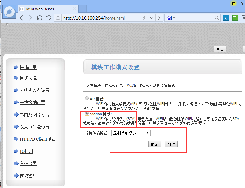 2:在電腦瀏覽器上輸入10.10.100.254.用戶名和密碼都是默認admin。進入設(shè)置界面,在模塊工作模式設(shè)置里,設(shè)置模塊的工作模式為station模式,點擊確認。