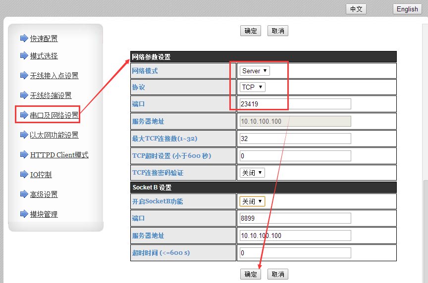 4:在串口及其他設(shè)置中,串口設(shè)置根據(jù)用戶設(shè)備更改設(shè)置。在網(wǎng)絡(luò)參數(shù)設(shè)置中,網(wǎng)絡(luò)模式設(shè)置為TCP Server .端口號設(shè)置為23419。點擊確認