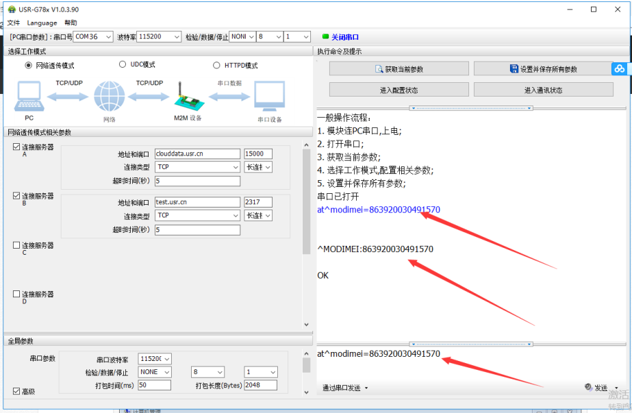 6. 再發(fā)送at+cgsn加回車,檢查一下剛才發(fā)送的是否成功。如下圖所示