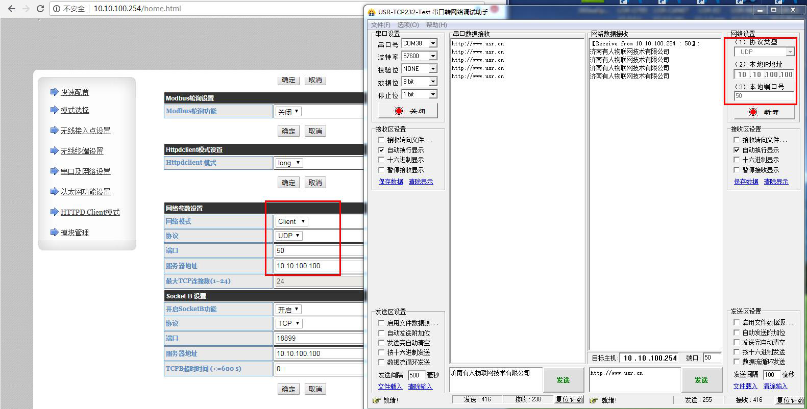 用USR-W630的IP 10.10.100.254 登錄USR-W630的網(wǎng)頁,然后修改W630的串口參數(shù)。測試4種工作模式下,串口和網(wǎng)絡(luò)的數(shù)據(jù)透傳。