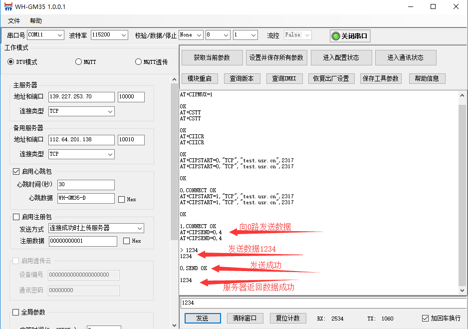 AT+CIPSTART=0,"TCP","test.usr.cn",2317 建立第一路 TCP 連接