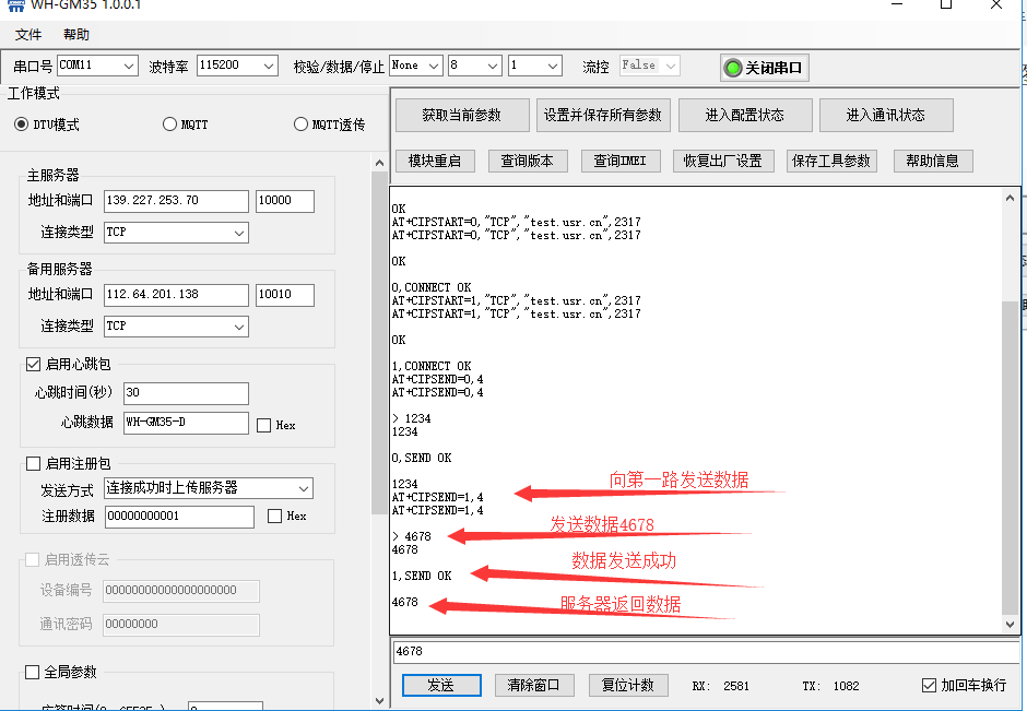 AT+CIPSTART=1,"TCP","test.usr.cn",2317 建立第二路 TCP 連接