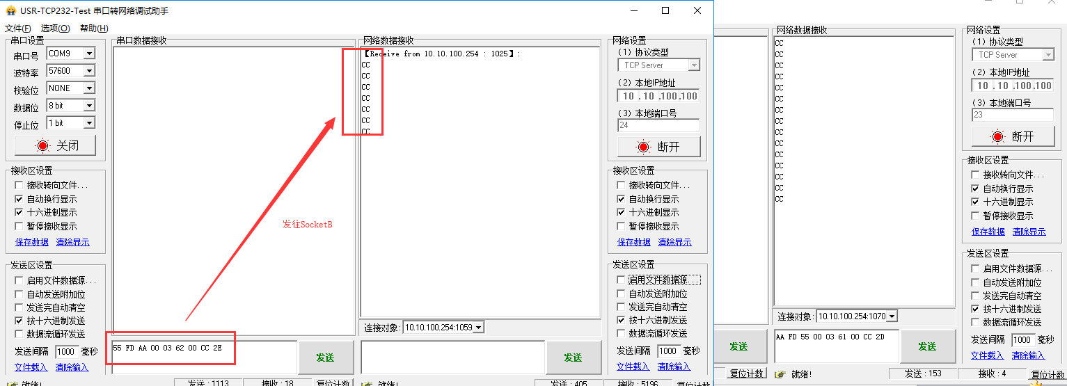 SocketA和B都重新斷開,重新連接,都可以給串口端發(fā)送數(shù)據(jù)!如圖所示