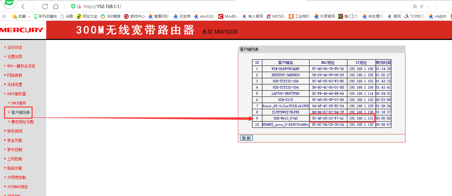 9、登進(jìn)路由器的內(nèi)置網(wǎng)頁(yè)可以看到此時(shí)路由器分配給W610的ip是192.168.1.131