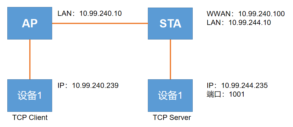 sta路由器下的子網(wǎng)設(shè)備設(shè)置靜態(tài)IP,如10.99.244.235,并開啟監(jiān)聽。(實際設(shè)備如果是PLC等設(shè)備要確認IP的設(shè)置和通信監(jiān)聽端口)。