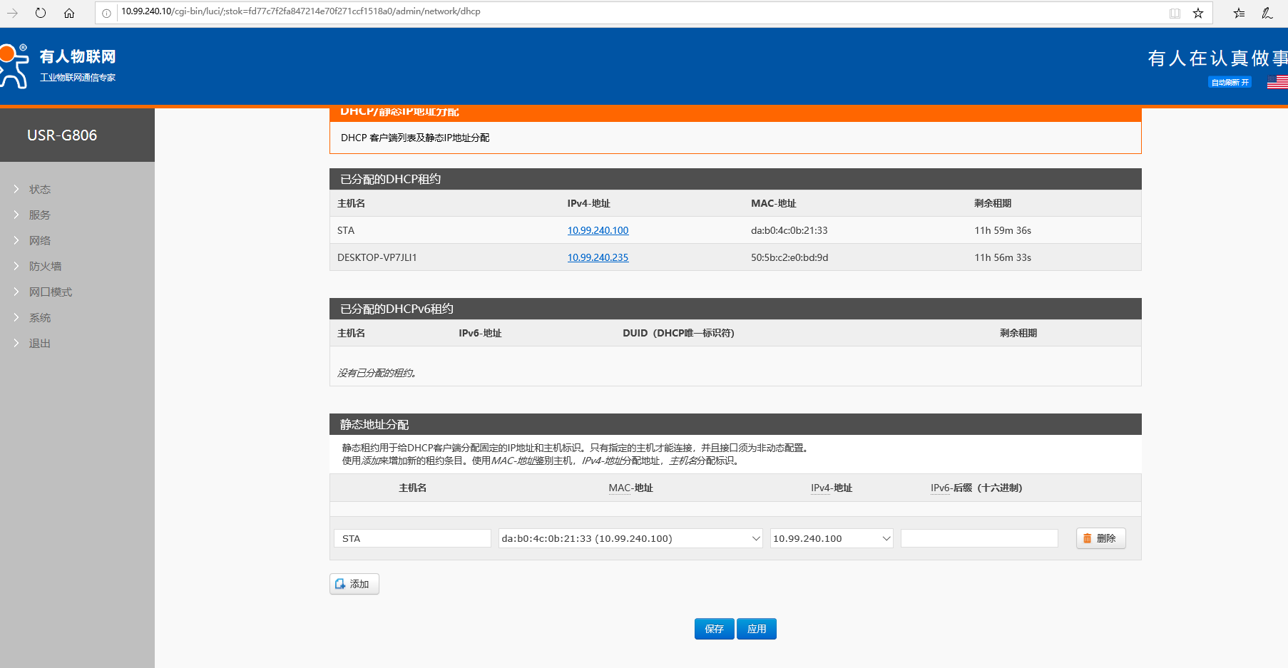 在ap路由器進入網(wǎng)絡(luò)----DHCP/DNS界面,設(shè)置mac綁定,為sta設(shè)備設(shè)定wwan口固定IP,比如10.99.240.100。設(shè)置完之后保存應(yīng)用,重啟設(shè)備