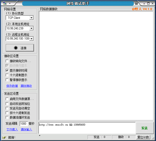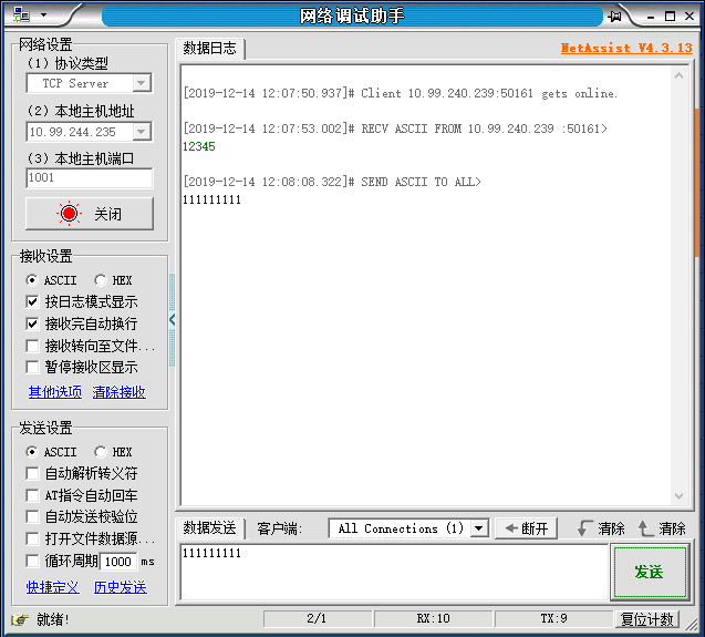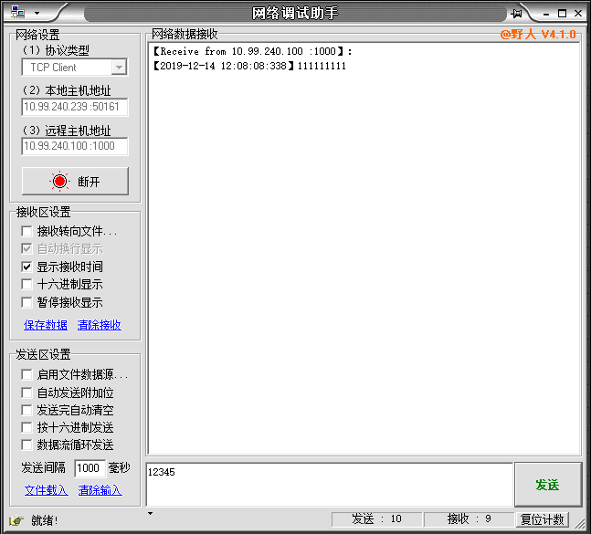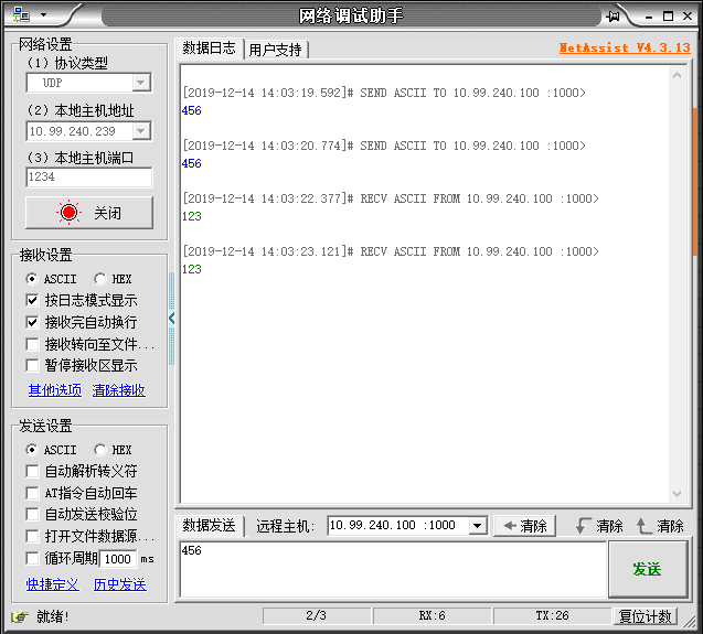 Ap下設(shè)備也更改為UDP協(xié)議,遠程主機的IP就是sta路由器的WWAN口IP地址10.99.240.100,端口是映射的外部端口1000,設(shè)置完后發(fā)送數(shù)據(jù),sta下的設(shè)備就能夠識別到數(shù)據(jù)來源,然后實現(xiàn)雙向數(shù)據(jù)傳輸: