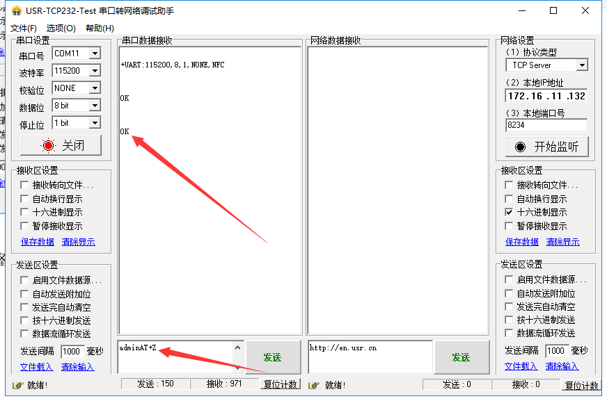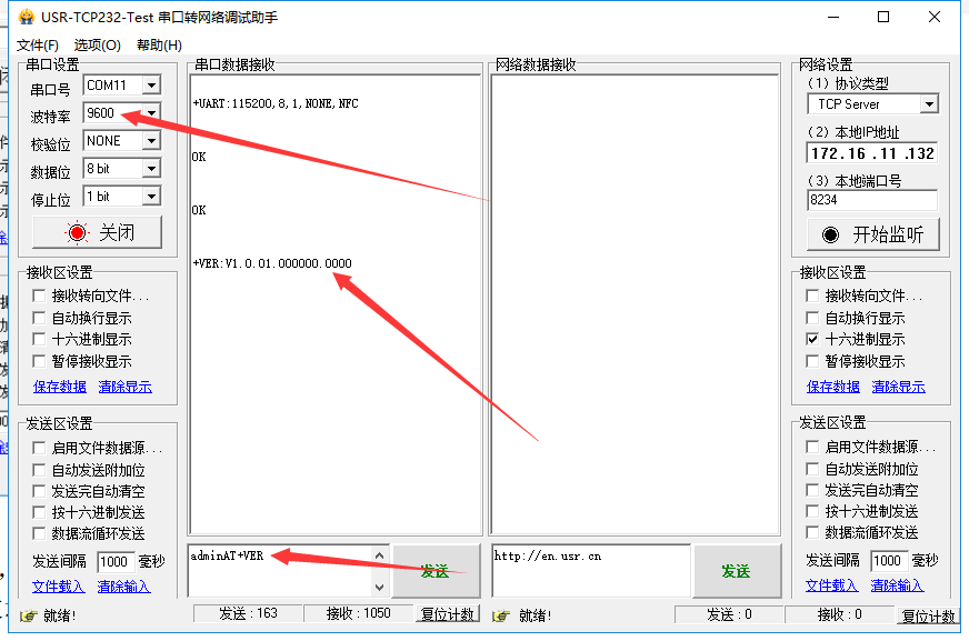 4. 生效之后,DTU會重啟,此時,將串口助手串口波特率修改為9600,然后重新打開串口,我們任意發(fā)送指令與DTU通信,可以進行正常通信。