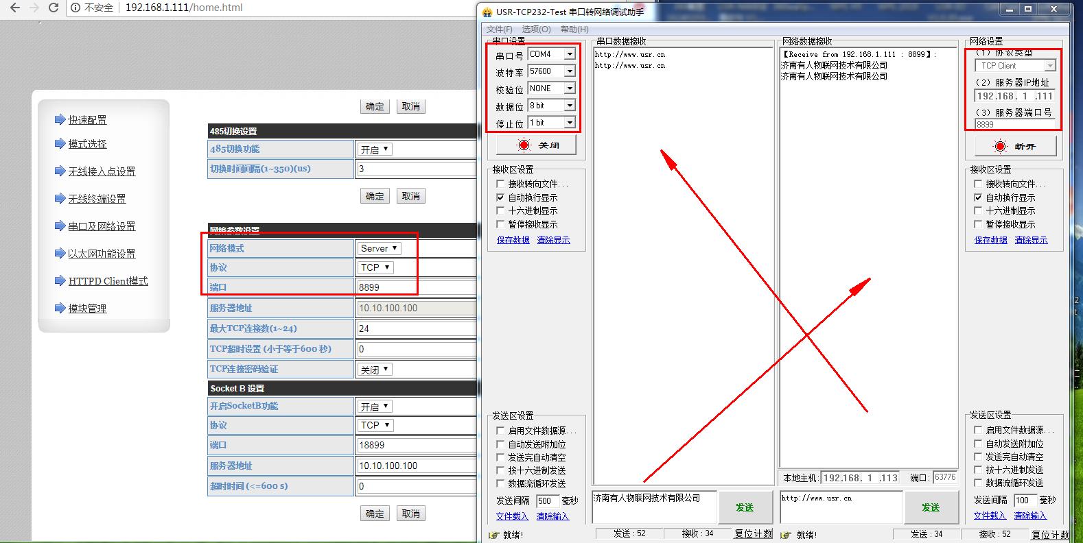 然后用USR-TCP232-TEST網(wǎng)絡(luò)助手測試串口和網(wǎng)絡(luò)之間的數(shù)據(jù)傳輸。