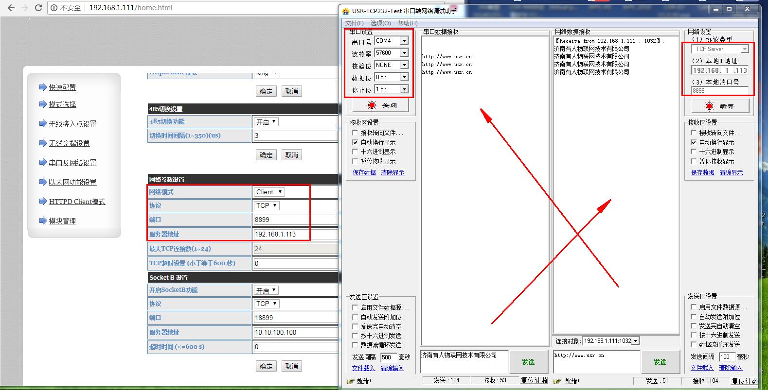 打開USR-TCP232-TEST網(wǎng)絡(luò)助手,左側(cè)串口部分用COM4打開,串口參數(shù)和DR404設(shè)置一致,網(wǎng)絡(luò)端設(shè)置TCP server,本機(jī)IP填電腦的IP 192.168.113,本地端口填8899。