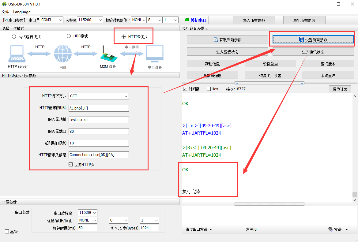 4. 打開串口后,先點(diǎn)擊進(jìn)入配置狀態(tài),如果模塊能返回+ok的字符,說明電腦和模塊連接是沒有問題的;然后點(diǎn)擊進(jìn)入通訊狀態(tài)如圖,做數(shù)據(jù)通訊測(cè)試。如果不返回+OK的話,請(qǐng)參考(步驟3)