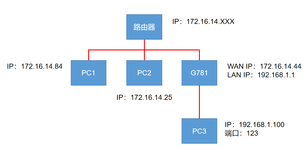 在G781中做端口轉(zhuǎn)發(fā),允許除PC2的設(shè)備訪問PC3的123端口