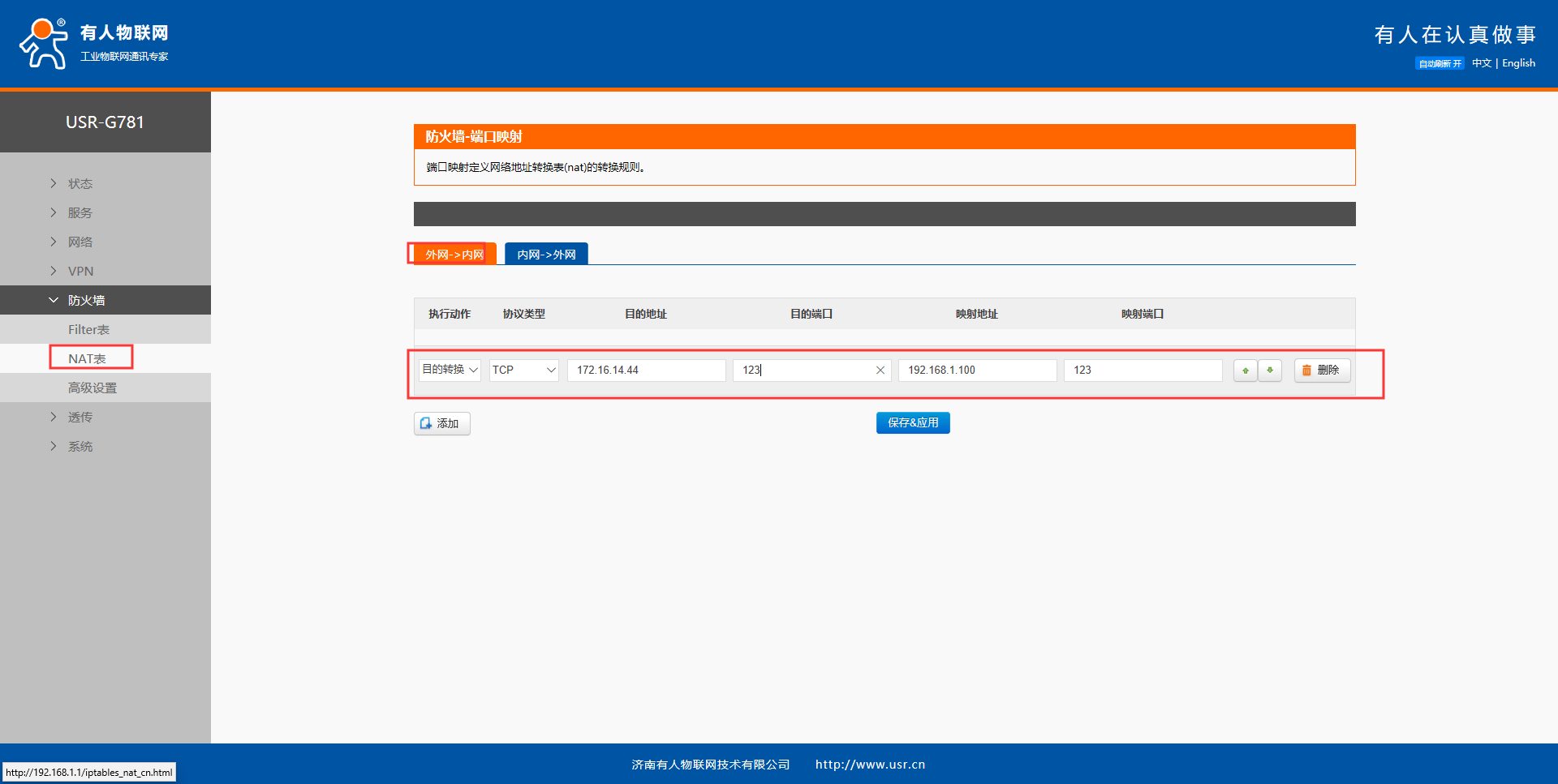 1、進入G781的內(nèi)置網(wǎng)頁,在防火墻的nat表中設(shè)置端口轉(zhuǎn)發(fā):