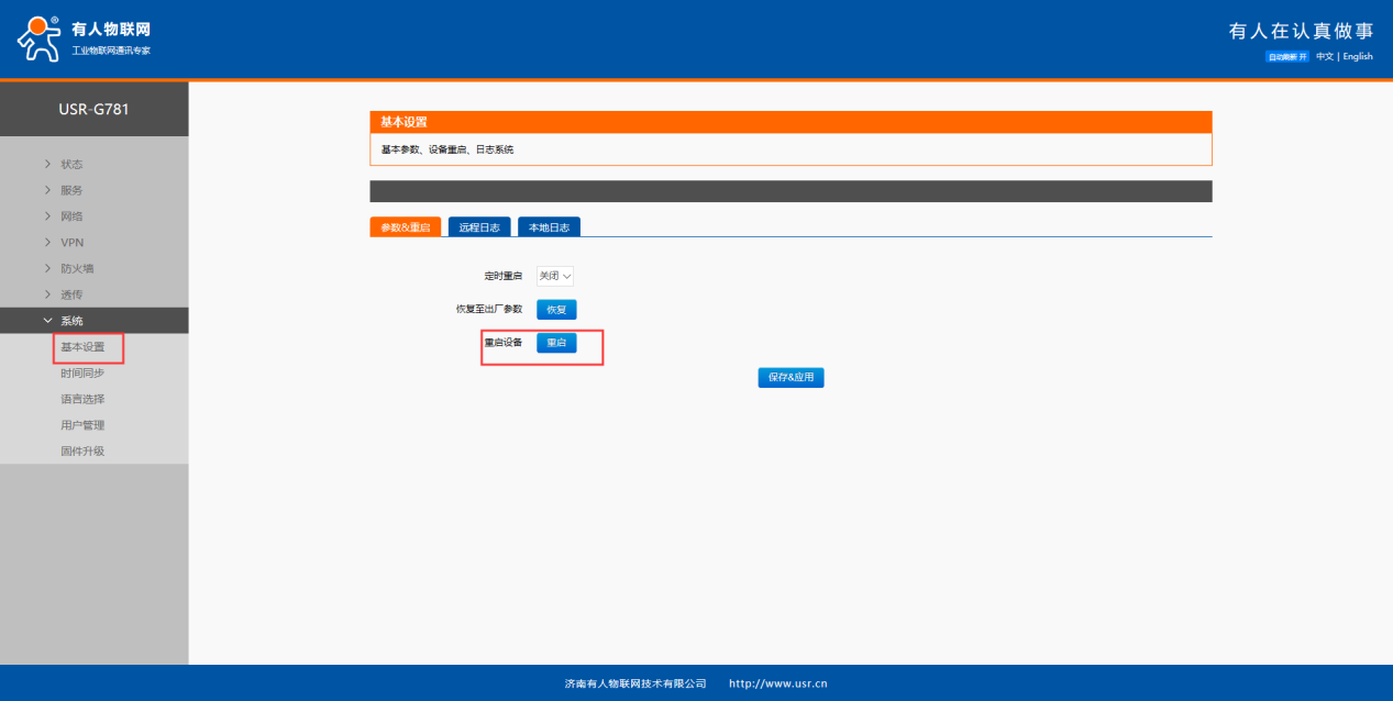 3、設(shè)置完成后,在系統(tǒng)---基本設(shè)置界面點擊重啟按鈕,重啟G781.