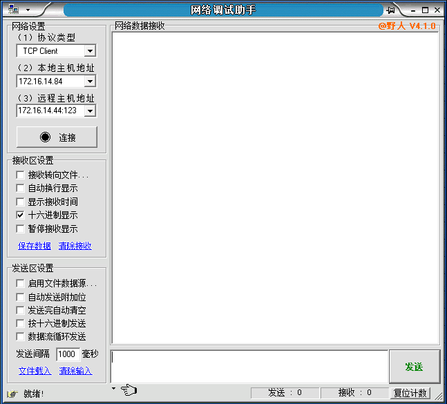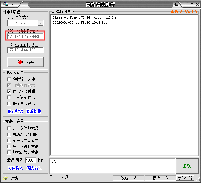 4、在PC2上打開網(wǎng)絡(luò)調(diào)試助手連接PC3,如下圖可以正確連接上,并能夠和PC3互相首發(fā)數(shù)據(jù)。