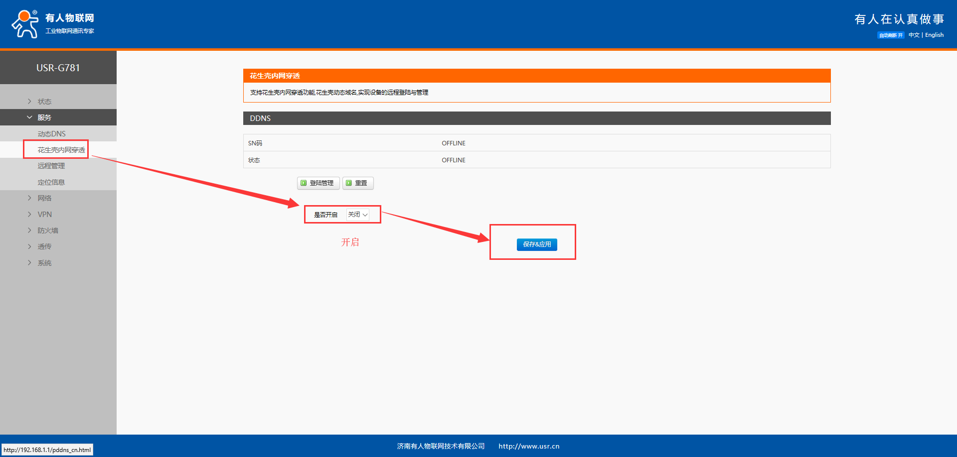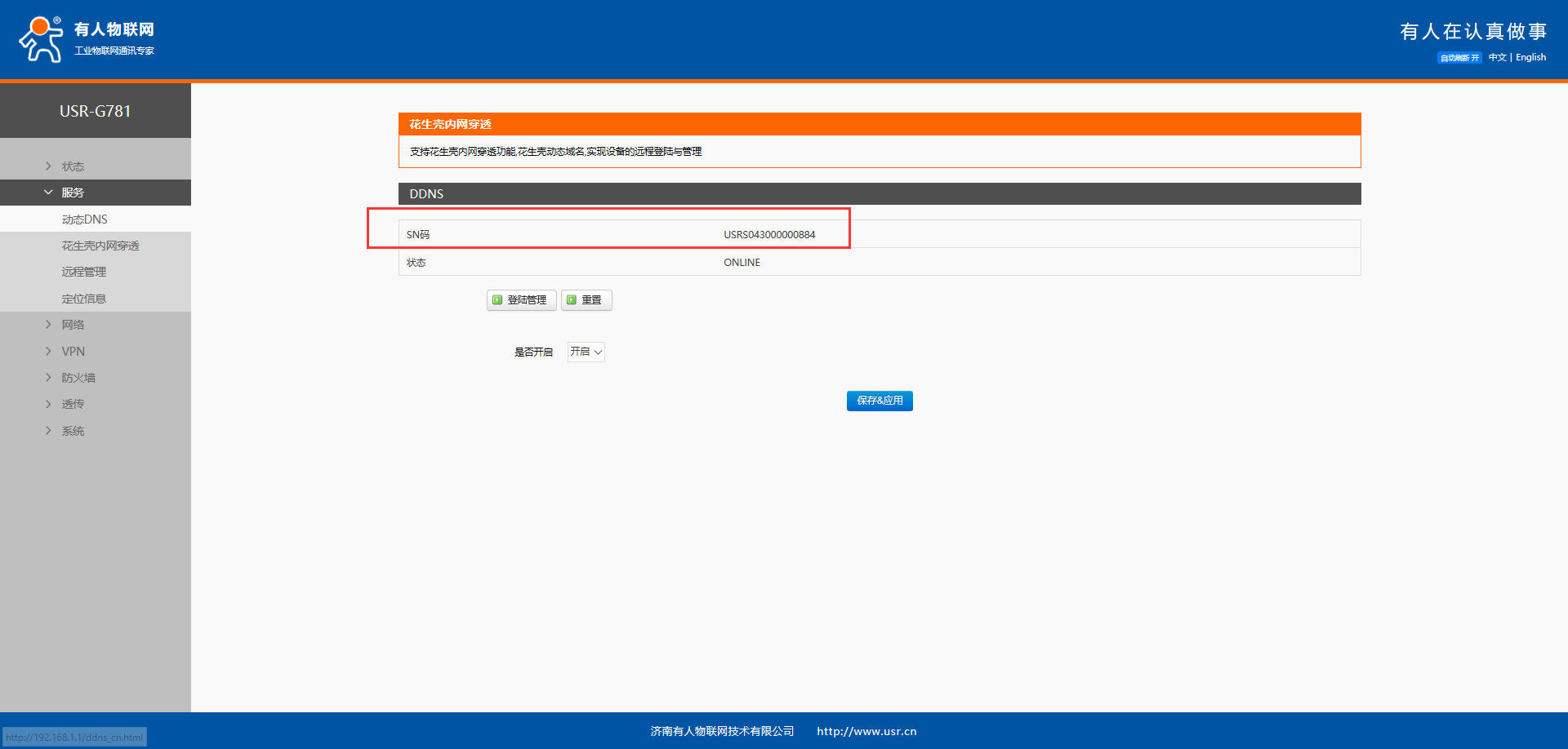 1、 啟用花生殼內(nèi)網(wǎng)穿透功能。選擇開啟,點(diǎn)擊保存&應(yīng)用,等待數(shù)秒,狀態(tài)會顯示ONLINE,并會自動識別到設(shè)備的sn碼,即成功開啟