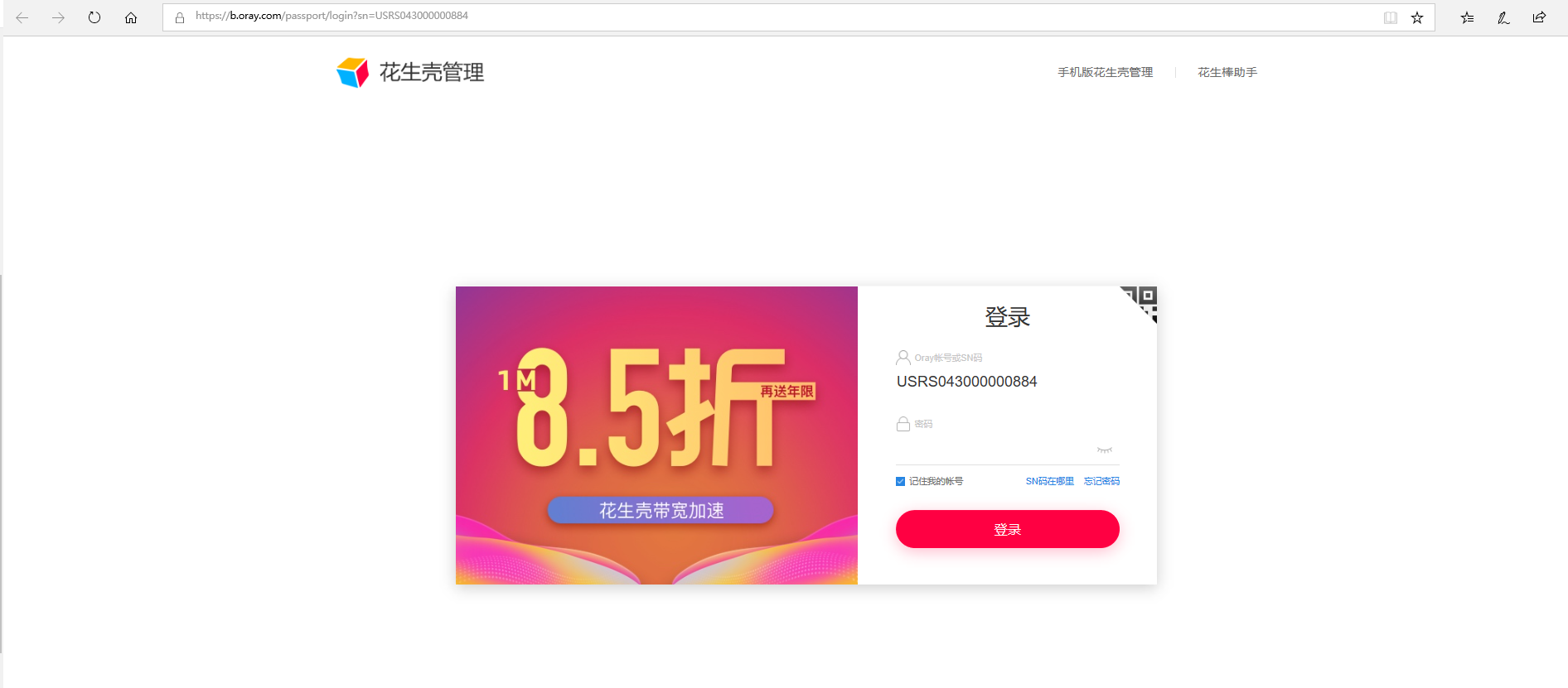 2、點(diǎn)擊登陸管理,頁面跳轉(zhuǎn)到花生殼登陸頁面,自動識別設(shè)備sn,默認(rèn)密碼admin。點(diǎn)擊登陸。