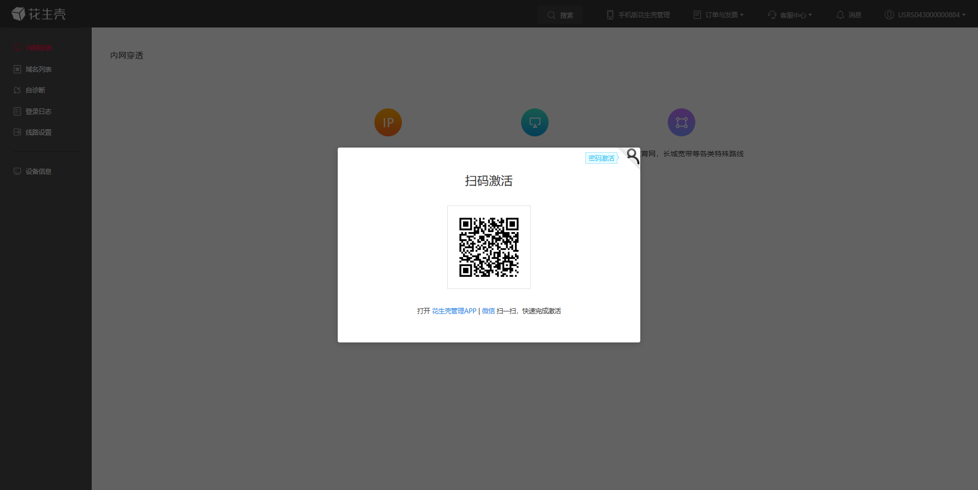 3、進(jìn)入頁面后顯示掃碼激活??梢杂檬謾C(jī)花生殼APP掃描二維碼激活或者點(diǎn)擊右上角,切換激活方式。