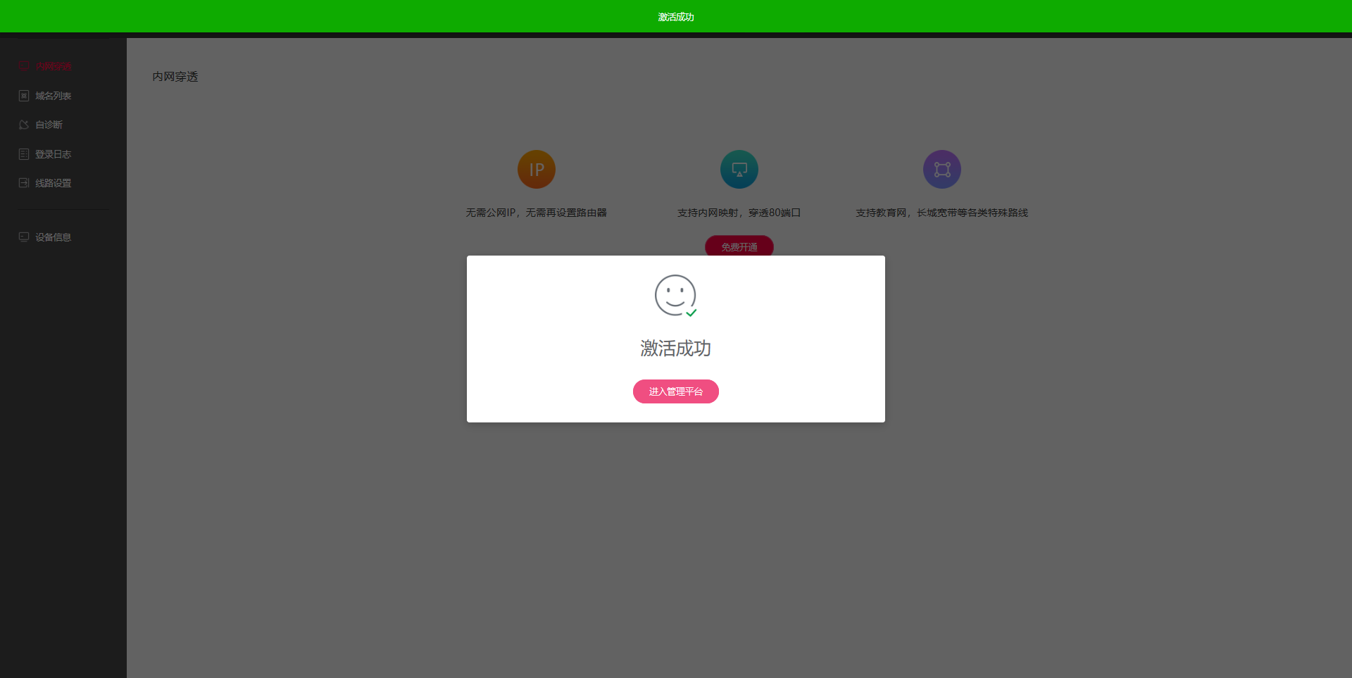 手機(jī)端確認(rèn)激活后,顯示激活成功,點(diǎn)擊進(jìn)入管理平臺。