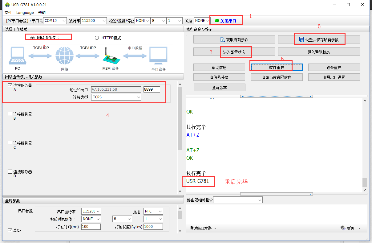 5、通過G781串口設(shè)置參數(shù),socketA作為TCPS監(jiān)聽端口