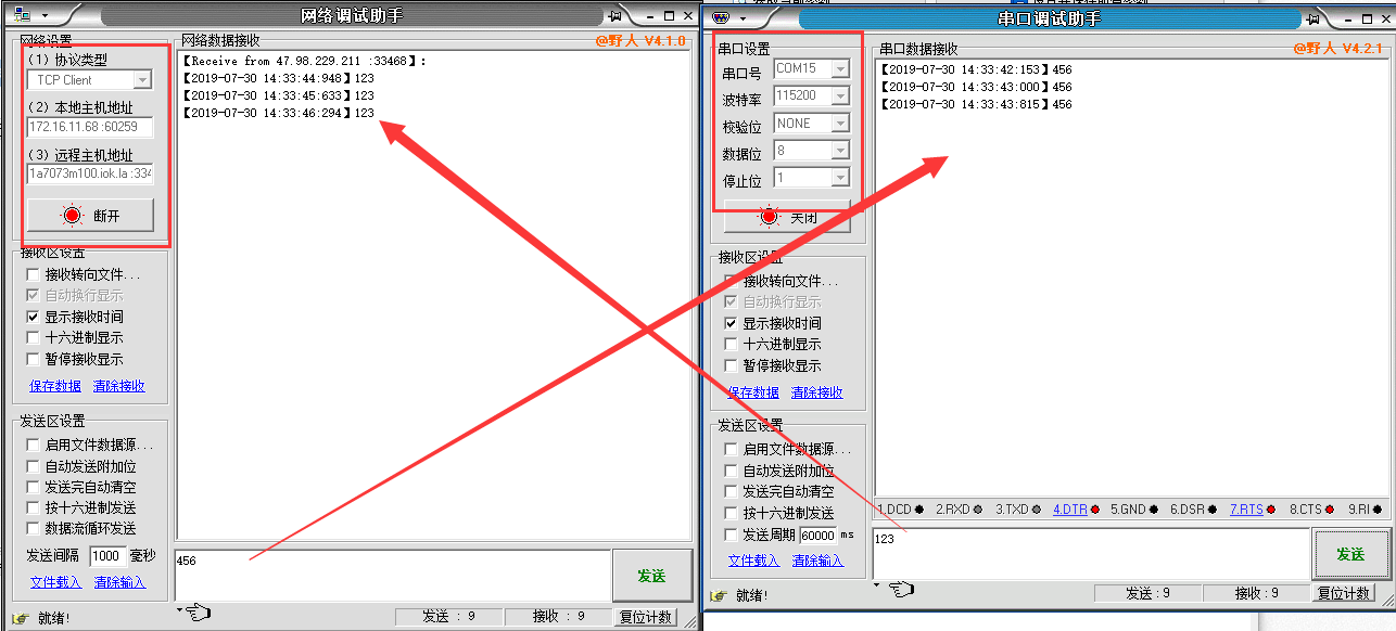 6、在可訪問公網(wǎng)的PC上打開調(diào)試助手,填寫服務(wù)器地址和端口(花生殼生成的域名和端口),點(diǎn)擊鏈接,G781的LINKA指示燈亮起;在G781串口鏈接的PC上打開串口調(diào)試助手,在發(fā)送區(qū)發(fā)送數(shù)據(jù),可以看到數(shù)據(jù)的雙向通信: