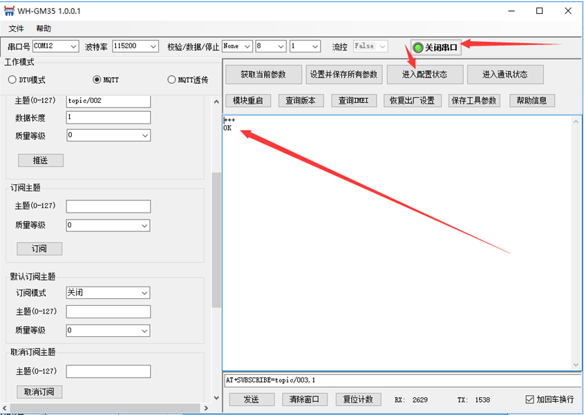 1、打開配置軟件,打開串口,點(diǎn)擊進(jìn)入配置狀態(tài)。模塊返回ok之后代表進(jìn)入配置狀態(tài)成功。