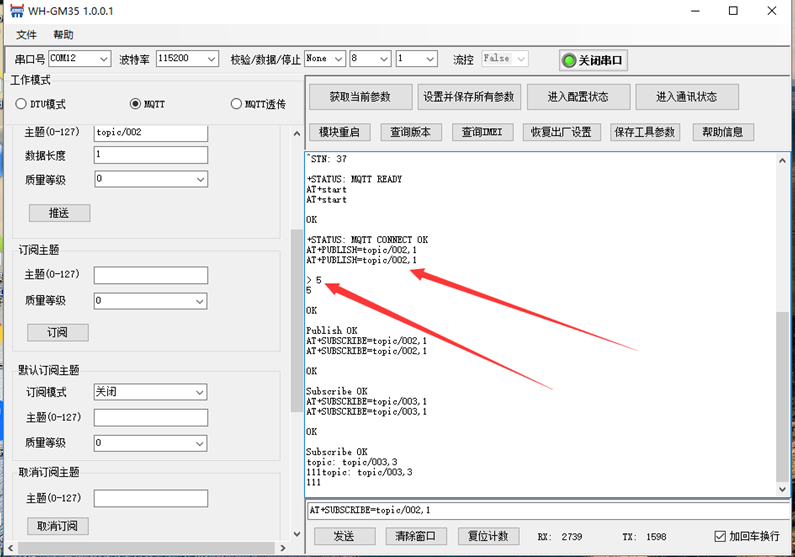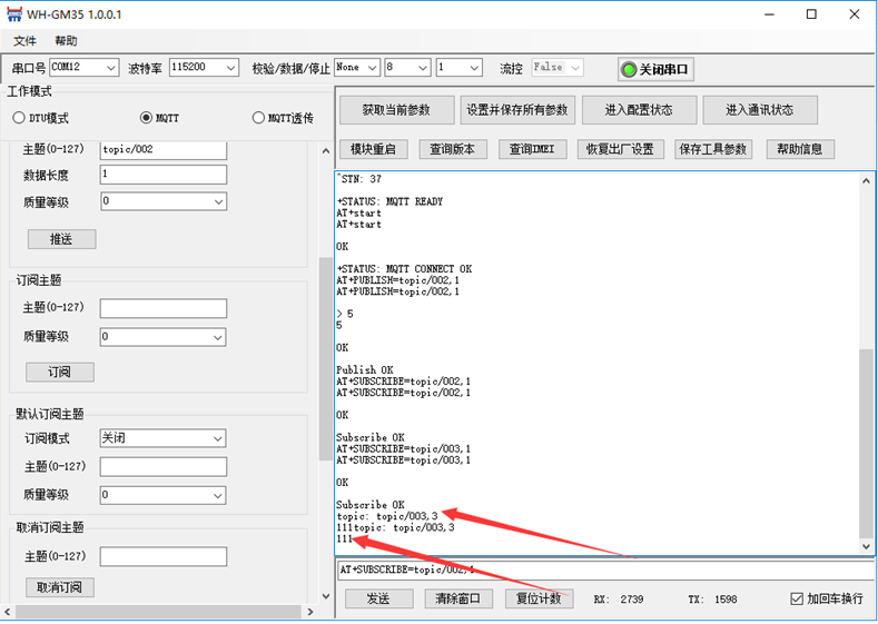 在配置軟件發(fā)送AT指令AT+SUBSCRIBE=topic/003,1訂閱該主題,接收到該數(shù)據(jù)