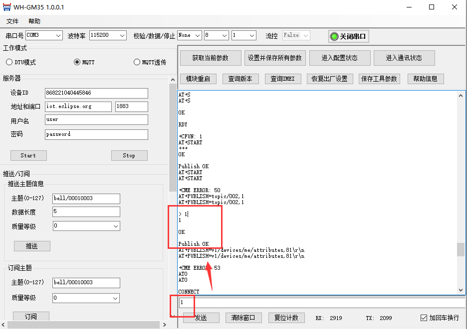3.配置要推送的主題點(diǎn)擊推送,在串口出現(xiàn)“>”之后在發(fā)送串口發(fā)送數(shù)據(jù),當(dāng)模塊接受到設(shè)置的長(zhǎng)度的數(shù)據(jù)時(shí)會(huì)自動(dòng)推送,服務(wù)器收到后模塊會(huì)返回一個(gè)Publish OK