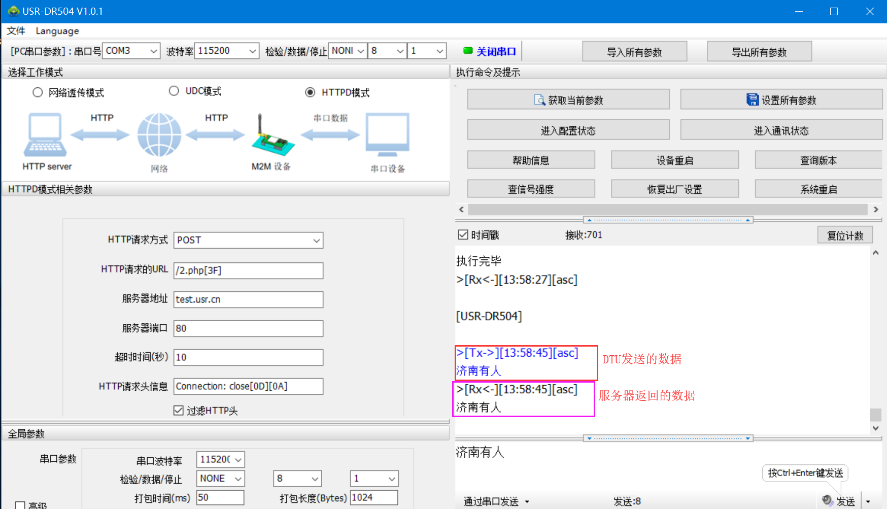 點(diǎn)擊進(jìn)入配置狀態(tài),返回OK說明進(jìn)入配置狀態(tài)成功-->配置HTTPD模式相關(guān)參數(shù)-->點(diǎn)擊設(shè)置所有參數(shù)-->點(diǎn)擊設(shè)備重啟