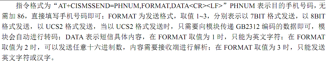 AT+CISMSSEND=PHNUM,FORMAT,DATA<CR><CL>