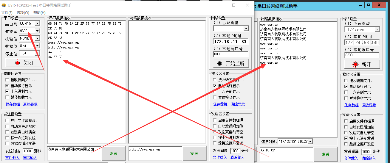 4.根據(jù)類 RFC2217 協(xié)議更改波特率,從網(wǎng)絡(luò)端動(dòng)態(tài)修改串口參數(shù),關(guān)閉串口,波特率更改為9600,打開串口發(fā)送數(shù)據(jù)如圖4.1、4.2(這種修改只是臨時(shí)性的,模塊重啟后,恢復(fù)原來(lái)的參數(shù))