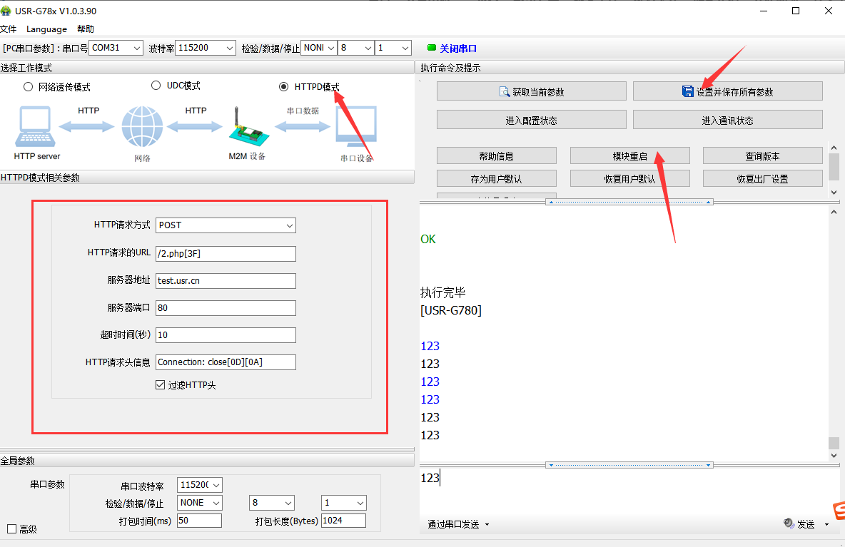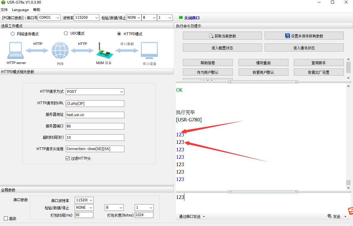 2.(打開串口后,先點(diǎn)擊進(jìn)入配置狀態(tài),如果模塊能返回+ok的字符,說明電腦和模塊連接是沒有問題的;