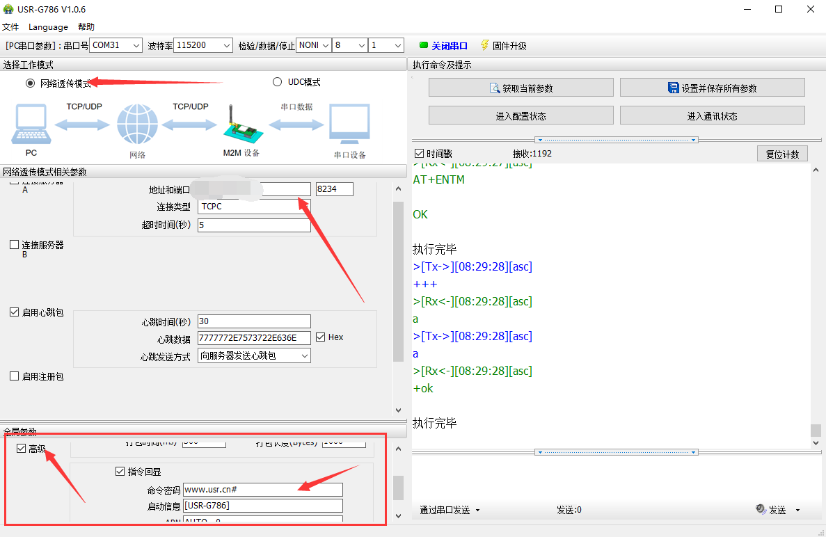 2.選擇網(wǎng)絡(luò)透傳工作模式,填寫要連接的服務(wù)器的IP和端口號(hào),勾選高級查看命令密碼(命令密碼可以自定義)