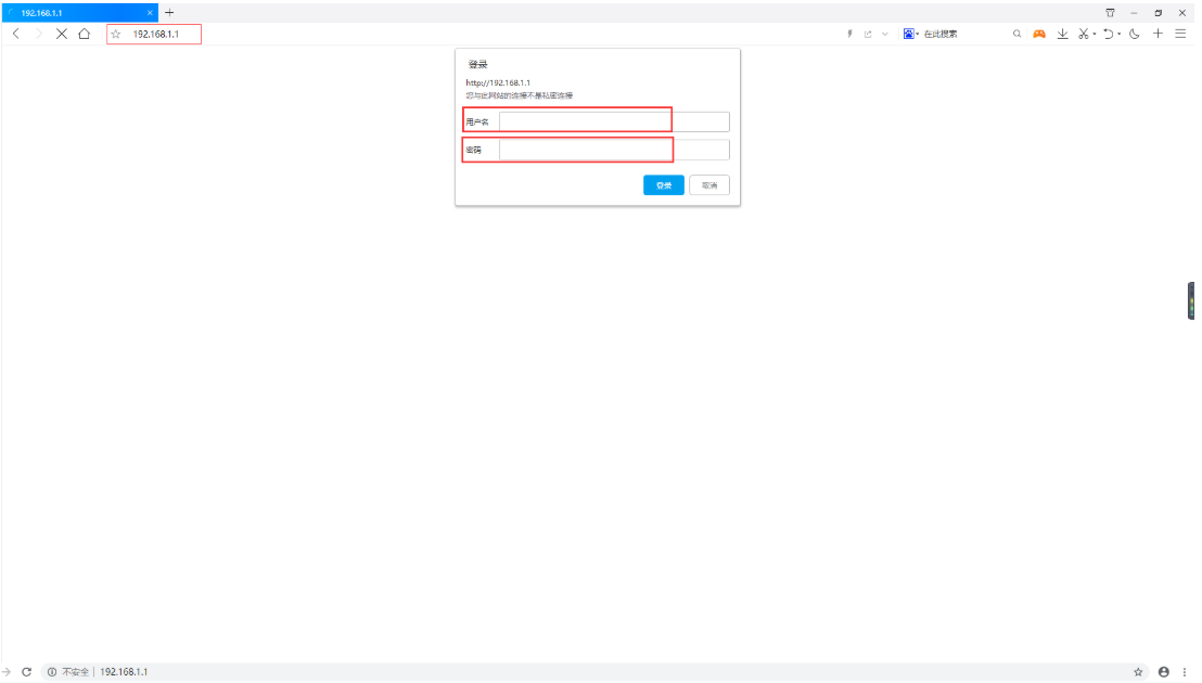 ②打開瀏覽器,在地址欄輸入192.168.1.1后回車,彈出登錄界面,填寫用戶名密碼(出廠默認(rèn)都是admin)點(diǎn)擊確認(rèn),即可進(jìn)入配置網(wǎng)頁(yè)。