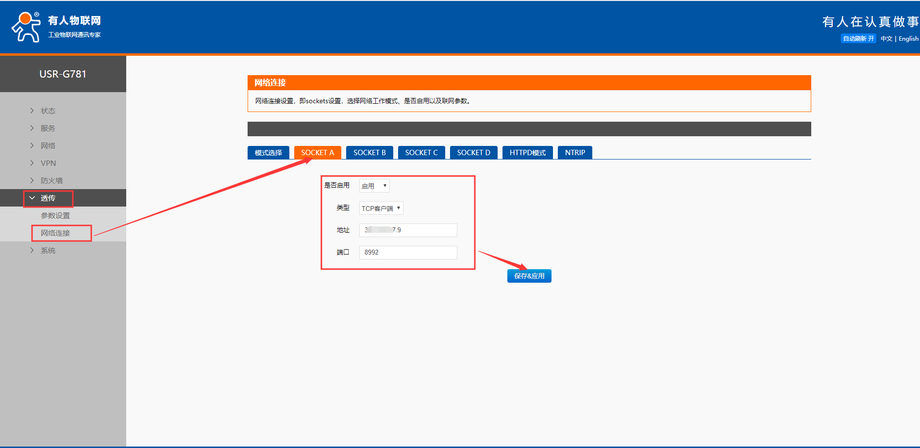 (2)透?jìng)鳌W(wǎng)絡(luò)連接——SOCKETA——啟用——設(shè)置IP和端口——保存應(yīng)用