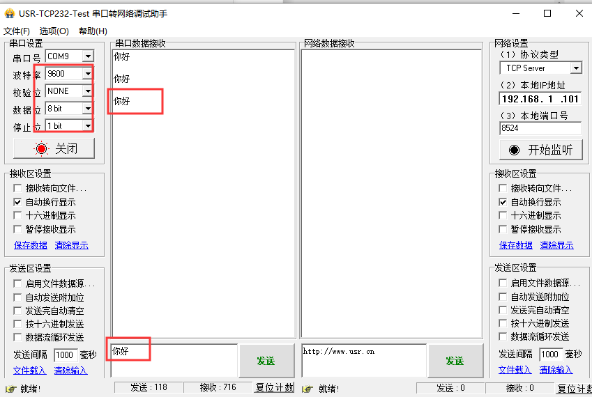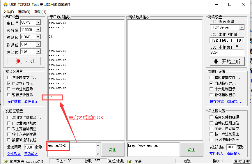 5、生效之后,DTU會重啟,此時(shí),將串口助手串口波特率修改為9600,然后重新打開串口,我們?nèi)我獍l(fā)送指令與DTU通信,可以進(jìn)行正常通信。