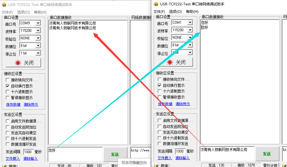 7.打開兩個(gè)USR-TCp232-TEST網(wǎng)絡(luò)助手,左側(cè)串口部分用COM9和虛擬串口COM1打開,串口參數(shù)和730設(shè)置一致。然后用兩個(gè)USR-TCp232-TEST測試串口和虛擬串口之間的數(shù)據(jù)傳輸。