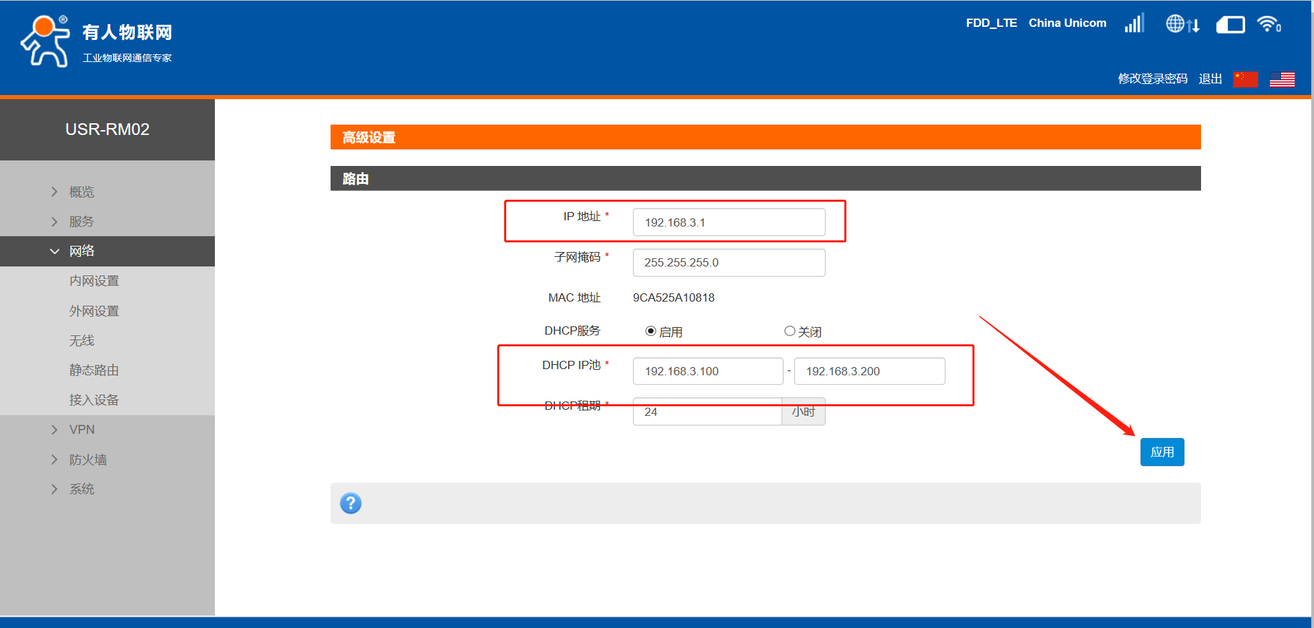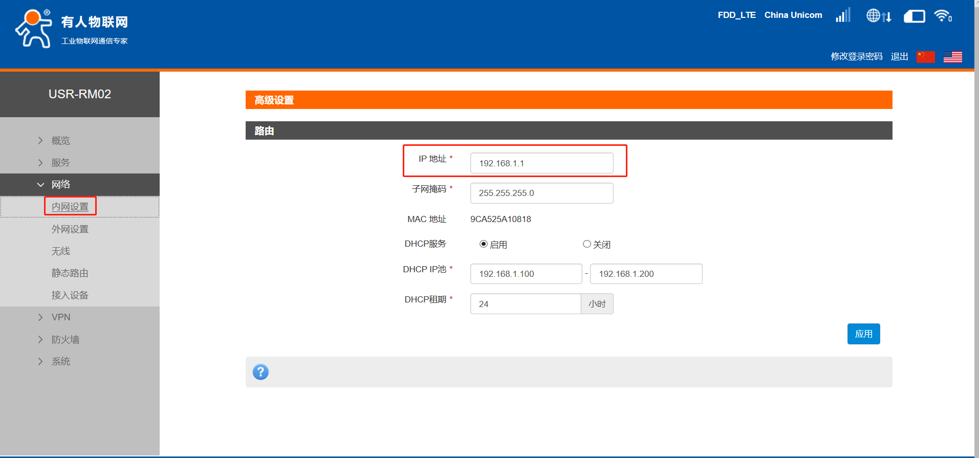 1、進入網絡--內網設置,進入修改界面,出廠默認,RM02的LAN口IP為192.168.1.1