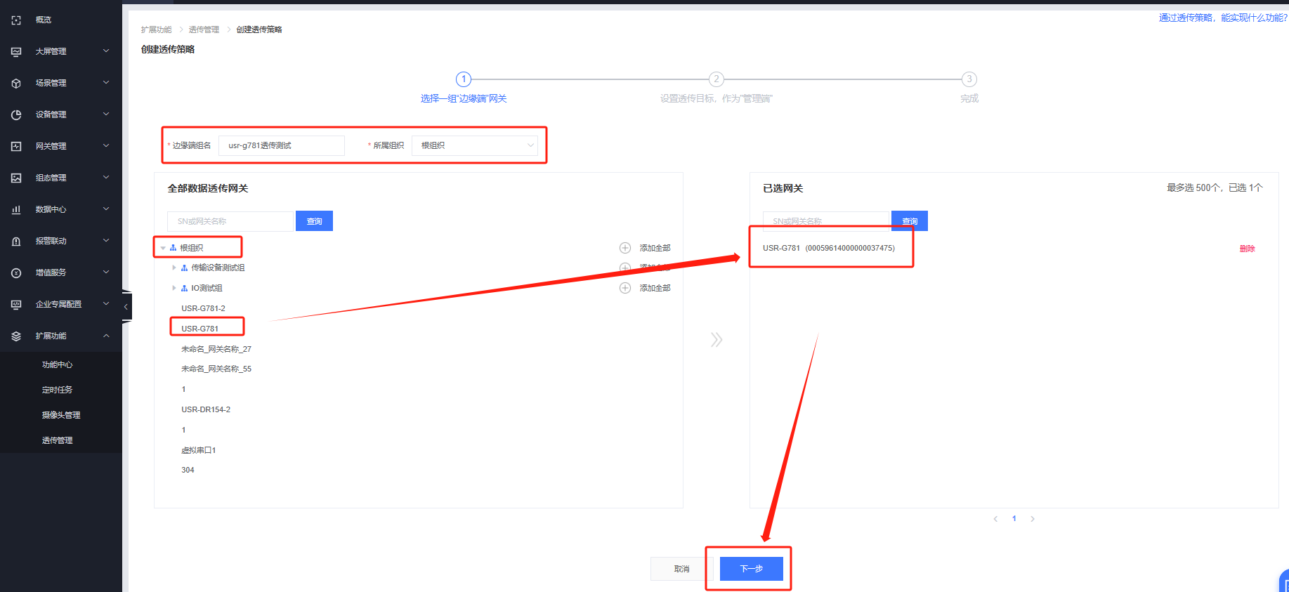 命名為781透?jìng)鳒y(cè)試,選擇根組織,選中網(wǎng)關(guān)后點(diǎn)擊下一步。
