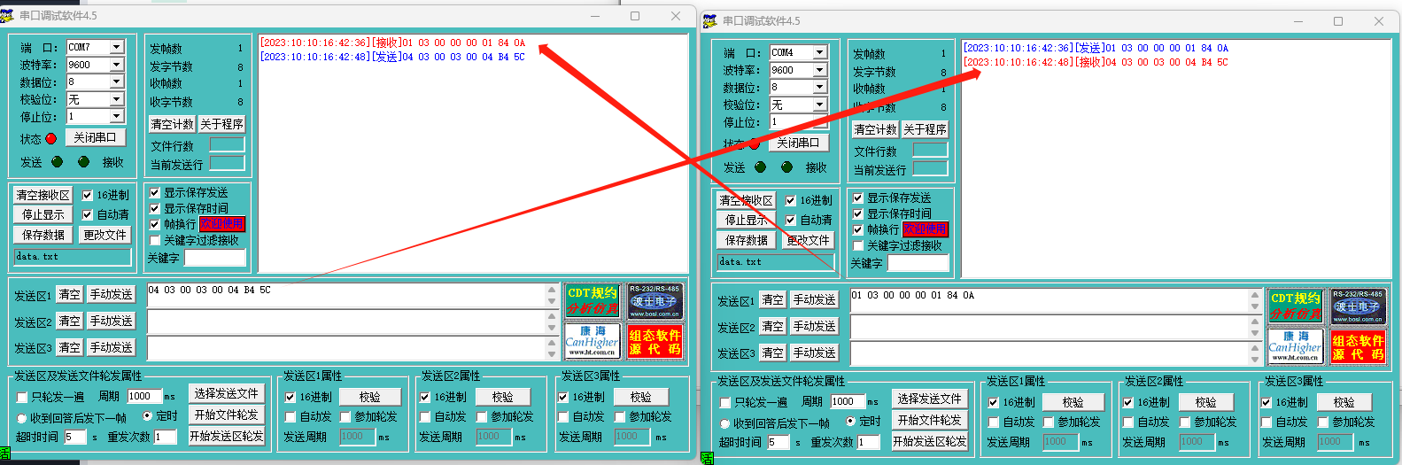 打開兩個(gè)串口調(diào)試助手互發(fā)數(shù)據(jù)測(cè)試成功。