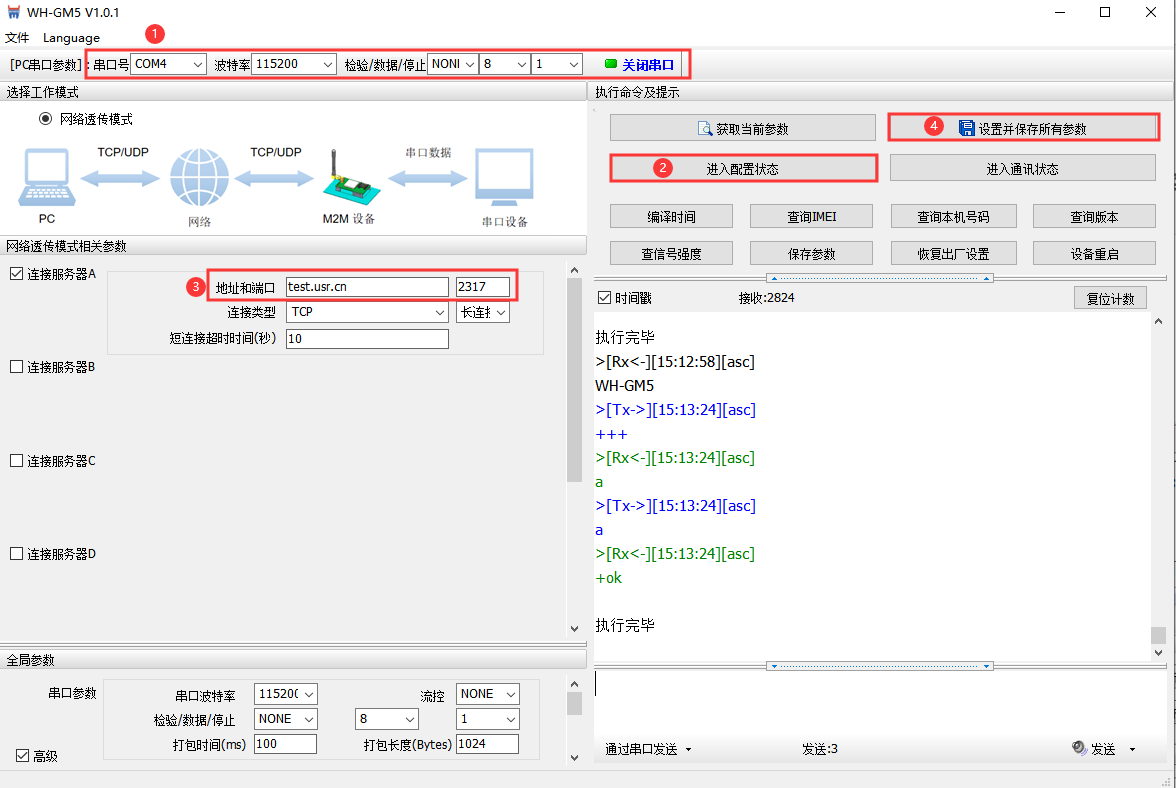 注:點(diǎn)擊進(jìn)入配置狀態(tài),如果模塊能返回+ok的字符,說明電腦和模塊連接是沒有問題的
