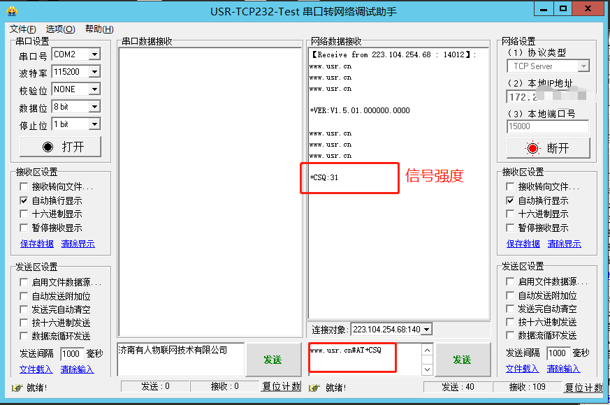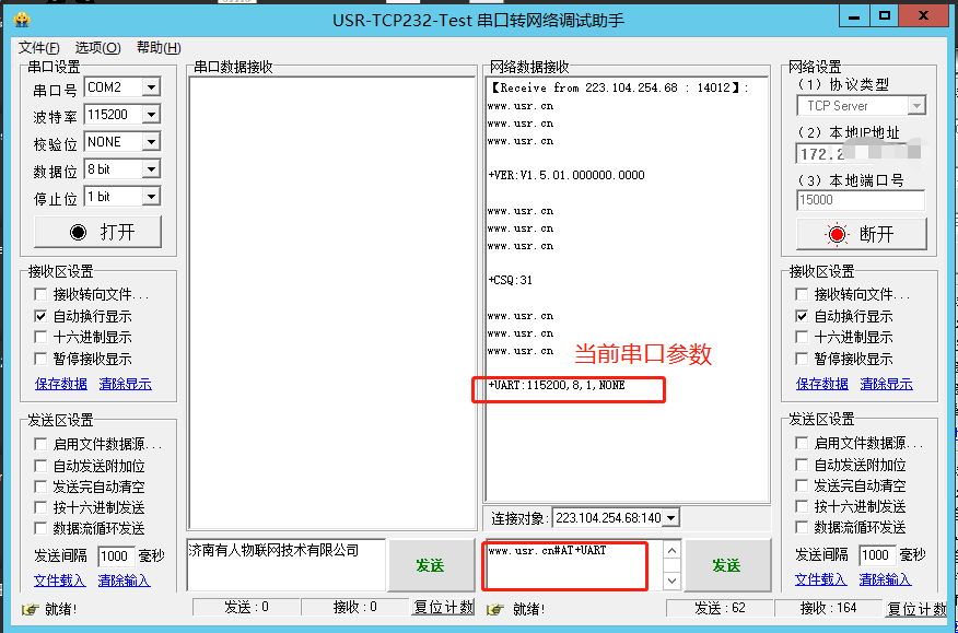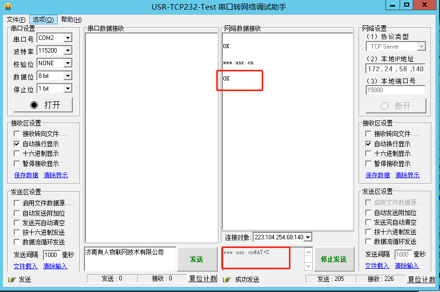 4、連接成功后,可以從服務(wù)器端發(fā)送網(wǎng)絡(luò)AT指令來(lái)查詢(xún)/設(shè)置DTU的參數(shù)