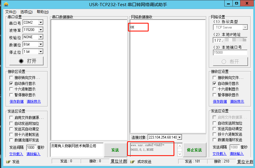(4)修改模塊當(dāng)前的串口參數(shù),波特率改為9600;返回OK即為設(shè)置成功