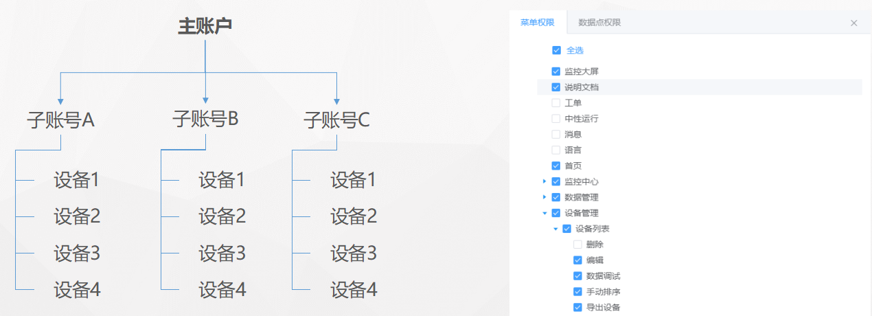主賬號(hào)監(jiān)控所有設(shè)備,子賬號(hào)之間相互獨(dú)立,只對(duì)自己可見(jiàn)。
